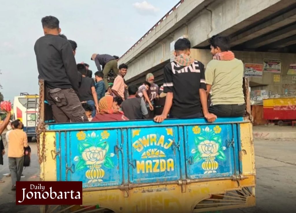 আবুল নামের এক গার্মেন্টস কর্মী বলেন, ‘ঢাকা থেকে পরিবার নিয়ে পাবনায় যাচ্ছি। বাসের তুলনায় ট্রাকে ভাড়া কম হওয়ায় পরিবারসহ ট্রাকে উঠেছি।’