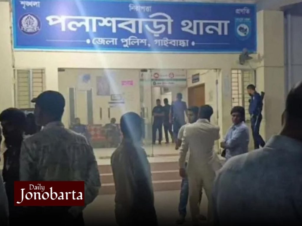 গাইবান্ধার পলাশবাড়ী থানায় ঢুকে পুলিশের ওপর হামলা ও মারধরের অভিযোগ উঠেছে উপজেলা যুব জামায়াতের কিছু নেতাকর্মীর বিরুদ্ধে। এতে থানার ওসি সরোয়ার আলম খানসহ অন্তত ৭ জন পুলিশ সদস্য আহত হয়েছেন। আহতদের উপজেলা স্বাস্থ্য কমপ্লেক্সে ভর্তি করা হয়েছে। এ ঘটনায় উপজেলা যুব জামায়াতের বায়তুল মাল সম্পাদক মাহমুদুল হাসান পলাশসহ ৯ জনের বিরুদ্ধে মামলা দায়ের করা হয়েছে। জড়িত সন্দেহে তৌহিদুল ইসলাম কানন নামে এক যুব জামায়াত নেতাকে আটক করেছে পুলিশ। বৃহস্পতিবার (২৬ মার্চ) দুপুরে পলাশবাড়ী থানার ওসি সরোয়ারে আলম খান মামলার বিষয়টি নিশ্চিত করেছেন। এর আগে বুধবার রাত সাড়ে ৯টার দিকে পলাশবাড়ী থানায় এ ঘটনা ঘটে।