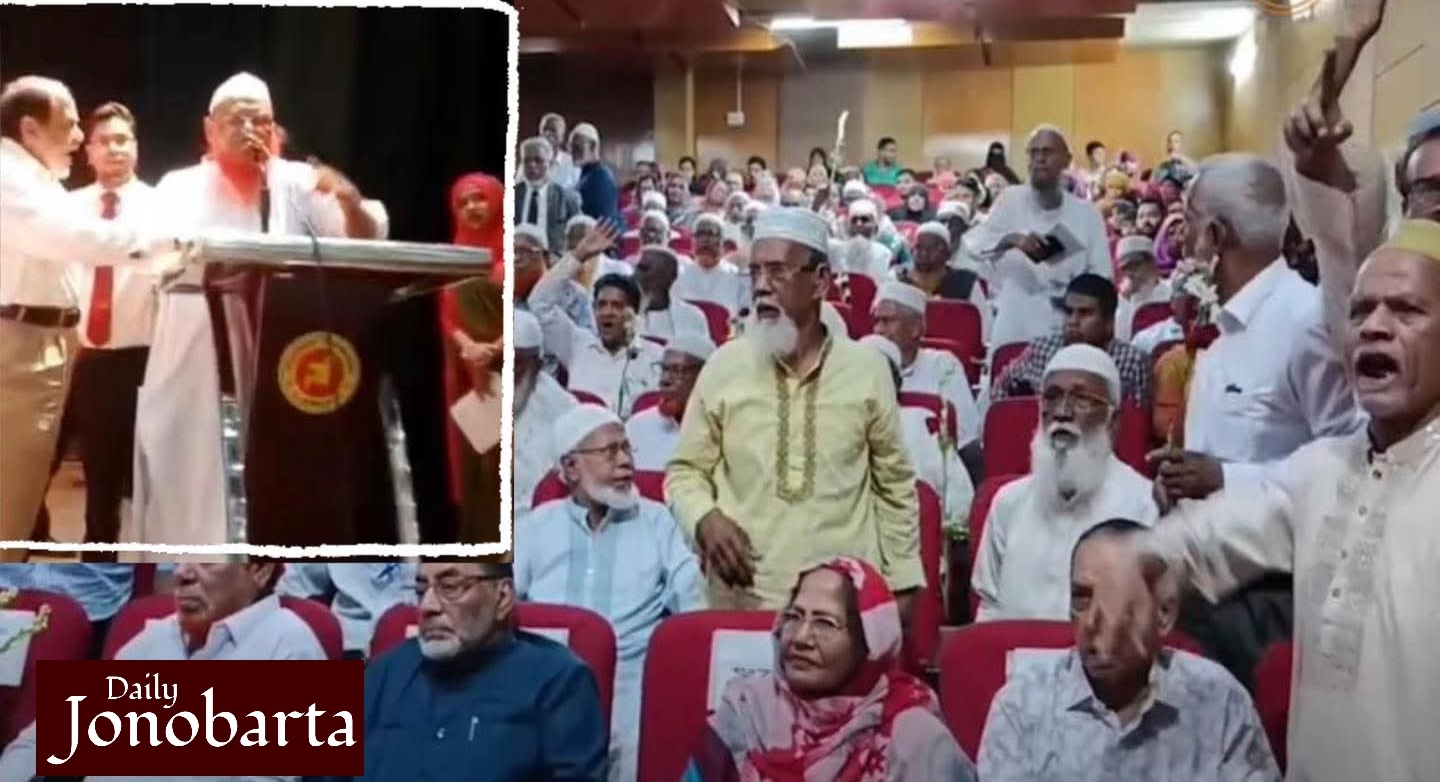 ‘মহান মুক্তিযুদ্ধে শেখ মুজিবের কোনও অবদান ছিল না’—জমিয়তে উলামায়ে ইসলাম বাংলাদেশের জেলার সভাপতি আব্দুল্লাহ হক কাওসারীর এমন মন্তব্যে ক্ষোভ প্রকাশ করেন অনুষ্ঠানে উপস্থিত মুক্তিযোদ্ধারা। একইসঙ্গে কয়েকজন বীর মুক্তিযোদ্ধা তাৎক্ষণিক দাঁড়িয়ে প্রতিবাদ জানান।